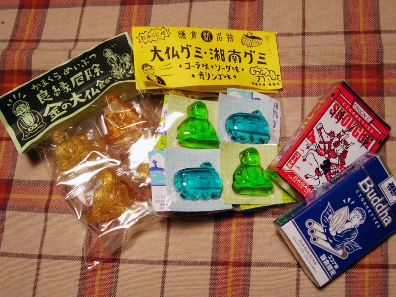 店内は子供と大人で溢れ返っているものの、何故か会計は空いており、その隙をうかがい、お土産用の鎌倉べっこうあめ「良縁・厄除け 鎌倉大仏あめ」と大仏グミ、湘南グミ「大仏コーラ&電車青りんご」とORION'S 駄菓子やオリジナル「シガレット」と鎌倉和三宝「鎌倉めぐり・さくら」(あ、写真撮り忘れた!)をワサワサと手にとり買ってしまいました。