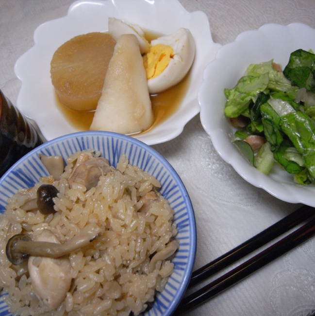 お家に帰ると丁度これからご飯と言うところでした。 お昼をさっき食べたばっかりなようで、あまり食べる気になれずでした。 ・お茶1杯 ・シメジと鶏肉の炊き込みご飯1杯 ・ウィンナーとレタスのサラダ オニオンスープ風ドレッシングで ・おでん 大根、玉子、はんぺん 弟くんがサラダを作ったのですが、かなりうまーでした。