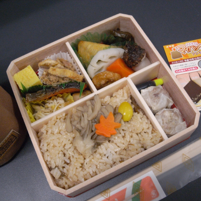 今日は初心に戻ってシウマイ弁当と見せかけて(どこにその必要が?)、ご飯を炊き込みご飯に変えて幕の内弁当スタイルの駅弁にしてみました。