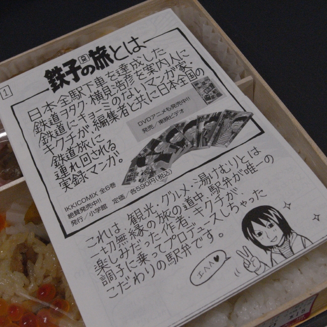 ネタ元は同僚の女の子なのですが、品川駅のJR構内で「鉄子の旅」の作者の菊池さんがプロデュースした駅弁を売っているらしいとの情報が流れてきました 品川駅で駅弁を買うのはたぶん当分ないと思い、記念に1つ(あ、このフレーズ懐かしい!)買ってみました。 JRの駅弁は高くてお味もそれほどいい訳ではないのですが、まあいいか。 (それとご飯とおかずの敷居がすぐへたって折れてしまうんですよね。)