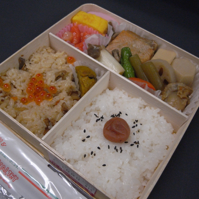 上でも紹介しましたが、品川駅の駅弁屋さんで買ったお弁当をいただきました。 ・アクエリアス ・鉄子の旅プロデュース 日本縦断弁当 まるごと北海道編 五目ご飯(いくらトッピング) 白飯(梅干し、黒ゴマトッピング) 煮物(里芋、タケノコ、ふき、蓮根、ニンジン、帆立) 鮭の焼き浸し(葱とシメジ添え) 鮭といくらの大漁漬け 玉子焼き 蒲鉾 カボチャのきんとん お味もかなりのもので素敵した。 (今回は上に書いているので省略します。)