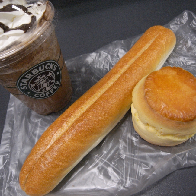 この寒いのにPART2で、温かいドリンクを買ってもどうせ仕事場まで持ってくまでに冷めてしまうので、それなら最初から冷たいのでもいいじゃんと思い、冷たいドリンクをスタバで買ってしまいました。 ・ジャバチップフラペチーノ トール(左) ・ピーナツフランス(中央) ・プレーンマフィン(右) マフィンはポロポロしちゃってやっぱりジャムとかクリームと一緒に食べた法が美味しいかと改めて思われ。