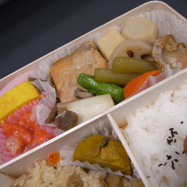 あれー、思っていたより美味しいじゃん! これって、鮭の塩焼きじゃなくて焼き浸しになっているし、生の鮭とイカのこうじ漬けなんてのも入っているし。 野菜の煮物もたっぷり入っていて、お肉なんてないのが逆に潔いくらいです。 このくらいならお酒のつまみにしながら食べることもできるし、しっかりお弁当として食べることもできるのでよいですなあ。