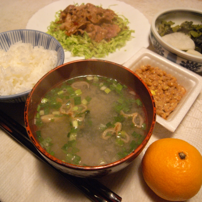 お腹ヘリヘリで家に帰り着くまでにバタンと倒れてしまいそうなので(ウソウソ!)、駅そばで軽くお蕎麦を食べてきました。 なので家ではちょっと軽めです。 ・たぬきそば ・ご飯軽く1杯 ・味噌汁(ワカメ、お麩、葱入り) ・納豆 ・豚肉の炒め物、キャベツのサラダ和え ・お漬け物 ・ミカン1個 おかげでお腹イパーイです。 (あれ、なんかまずくないかい?)