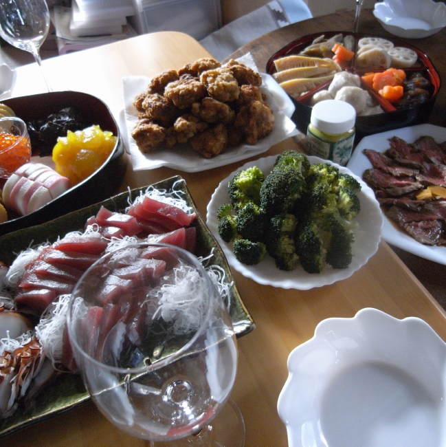 お昼前には兄達も揃ったので、みんなでお昼ご飯をいただきました。 いつものおせちもグレードアップして、ローストビーフ、フライドチキン、鮪とたこのお刺身、ブロッコリと並びます。 フライドチキンは漬け汁やつなぎ、ハーブフラワーなども工夫してケンタッキーフライドチキンの味を真似してみました。 (とうてい真似できるものじゃありませんが、そこそこ美味しくできましたよ!) 一応ケチャップとマスタードも用意しましたが、まったく必要ありませんでした。