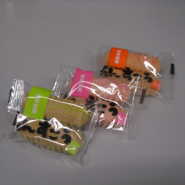 これは沖縄銘菓ちんすこうなんですが、実は昨年末からあったとか。 (あれ、そういえば私風邪で死んでたから仕事場に来てないや。) シークァサーとマンゴーとグァバ味がありますが、この中で一番美味しかったのは、なんとグァバでした。 私にはシークァサーはあの酸味の加減が、マンゴーはあの甘みの加減がちょっと強めで、グァバが丁度良い感じでした。