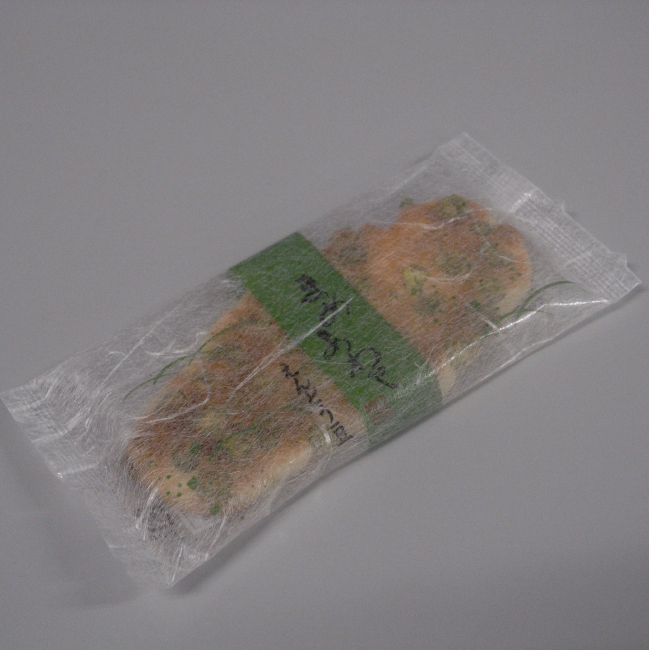 これは京都土産のえんどう豆のお煎餅。 お煎餅の塩加減が丁度良く、お茶請けのお菓子というよりもお酒(あんまり飲まないけどこれに合うのは日本酒かな)が欲しくなる感じ。 でも、会社で昼間からそんなことやると怒られますので(怒られる程度ですむんでしょうか?)、まずは日本茶を入れてズズーっとしてからが一番でしょうね。